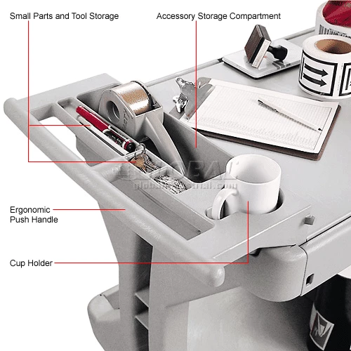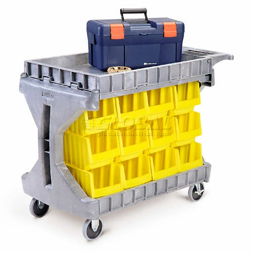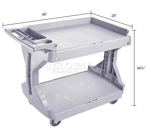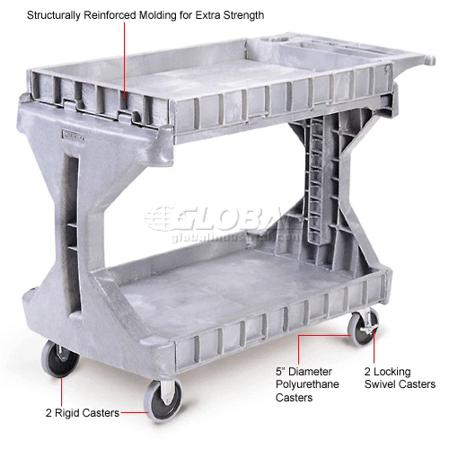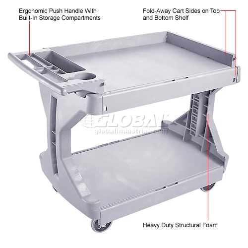 Cart sides flip up or down on top and bottom shelves to offer versatility of a full or partial tray or a smooth, flat work surface. Solid space saving I-beam frame doesn’t obstruct access to lower shelf like four post carts. Ergonomic handle offers built in storage compartments – perfect for tools, pens, cups and more. Heavy-duty structural foam construction yields 400 lb. capacity (200 lb. per shelf). 5″ casters offer easy, smooth rolling and two locking brakes.