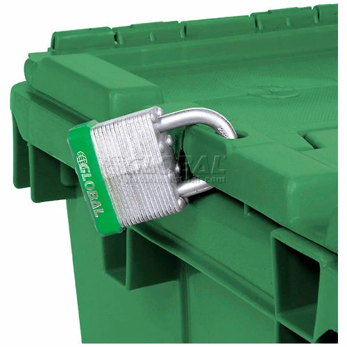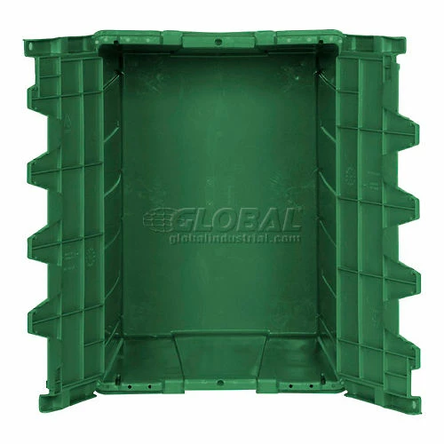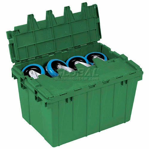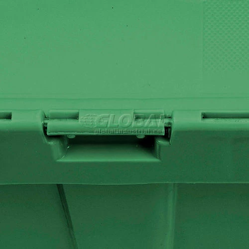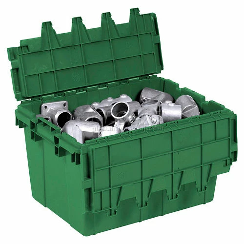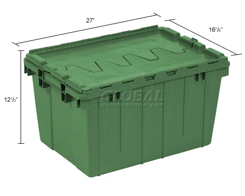 Heavy-duty Returnable and reusable Versatile high-density gray containers made of industrial grade polymers have permanently attached flip-up lids that interlock for stacking strength and can be locked with security seals. Solid bottom. Boxes nest with lids open. 27″L X 16-7/8″W X 12-1/2″H. Sold in quantities of 4.
