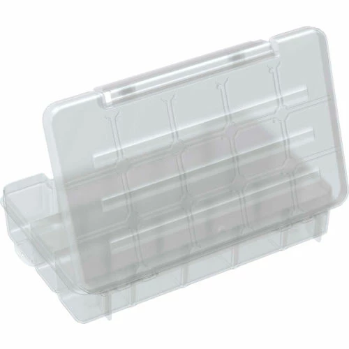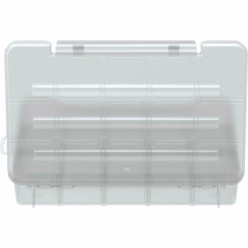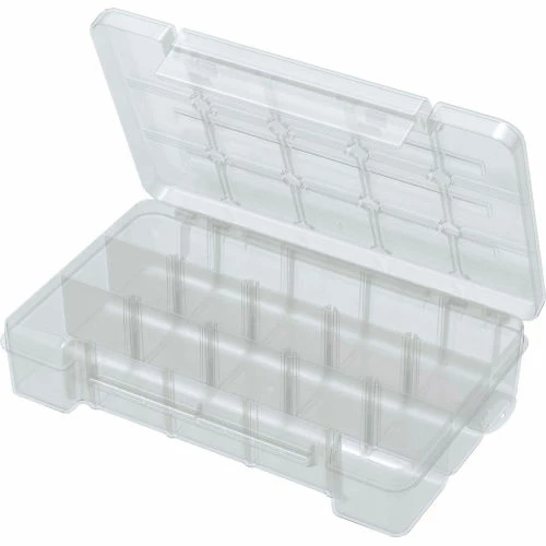 Medium storage case 11 x 7 x 2-3/8 15 compartment Clear Grid design in lid keeps items from spilling into other compartment includes 4 front to back adjustable dividers 2 fixed side to side dividers