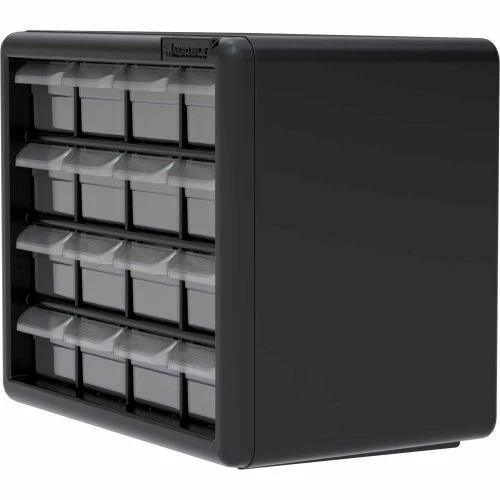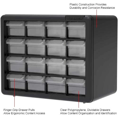Black Cabinet frame Strong plastic cabinets organize and protect components. Cabinets stack securely and can also be wall mounted with keyhole slots. 16 Clear polypropylene, dividable drawers offer easy content identification. Finger-grip drawer pulls provide easy access and rear stop tabs prevent contents from spilling. Drawer size is 2-1/8″ x 1-1/2″ x 5-1/4″.
