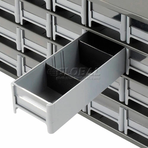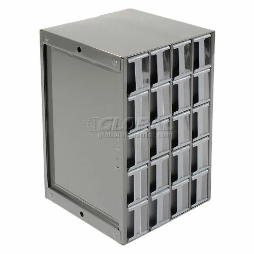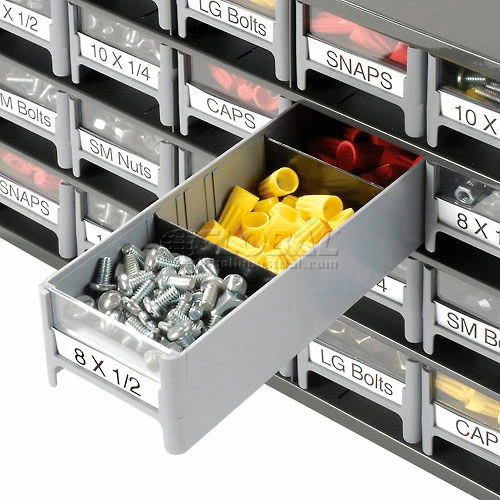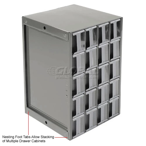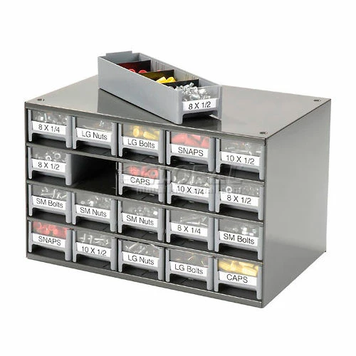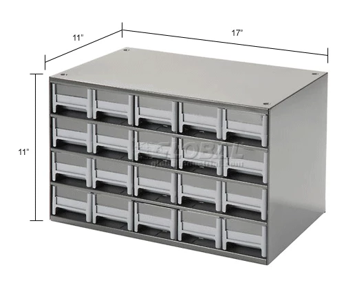 This modular 20 multi-drawer steel frame cabinet features galvannealed steel frame with a gray powder coat finish, make it rust proof, chip proof and scratch resistant. High impact styrene scoop bottom drawers with clear fronts and molded in label holder. Overall cabinet size is 17″W x 11″D x 11″H. Nesting “feet” for stable stacking. Includes two dividers and one label per drawer.