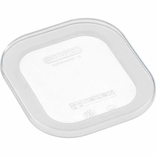 Silicone Food Storage Lid, GN 1/6 size, -40ยฐF to 392ยฐF temperature range, airtight, stackable with lid on, transparent, HACCP compliant.