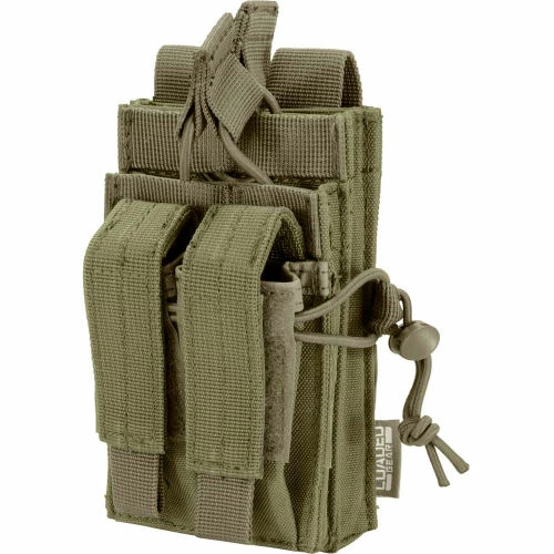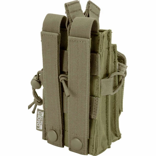 The Loaded Gear CX-950 Dual Stacked Rifle/Handgun Mag Pouch (Green) is an open-top mag pouch that has been designed to secure standard M4/M16 30 round rifle magazines with adjustable elastic drawstring flaps. The CX-950 also features two smaller Velcro pouches that accommodate most standard handgun magazine pouches. The CX-950 utilizes the MOLE attachment system, allowing this mag pouch to be attached to virtually any tactical vest, backpack, range bag, or any other piece of equipment that uses the MOLE system.