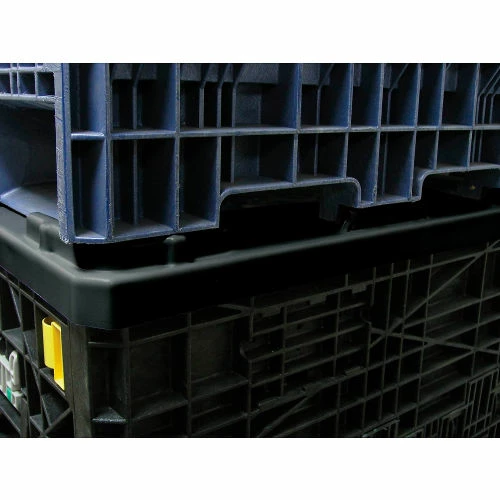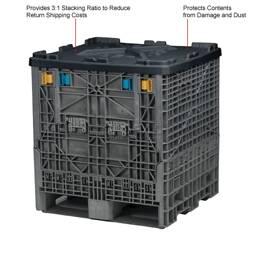 Made of black industrial grade polymers, resists rust, odors and moisture. 3:1 stacking ratio for money-saving return shipping. Add lid to protect the contents.