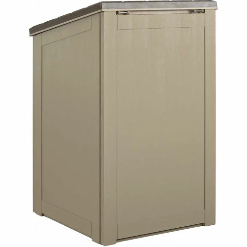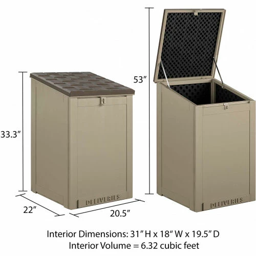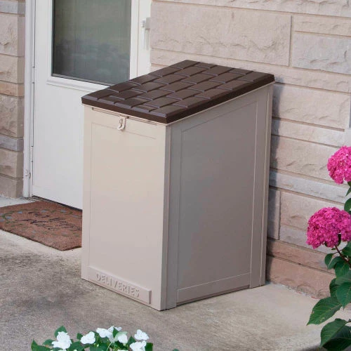 - Durable construction with weather-resistant, double wall panels and angled design of shingled roof keep packages dry. Features dark brown roof and tan siding that will compliment a wide range of home exteriors. 45 gallon storage capacity