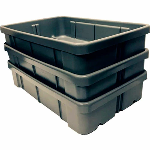 Durable vacuum-formed plastic boxes are designed for use with automated conveyor systems. Stability grooves on bottom provide easy, even ride on conveyors. Extra wide external box lips minimize shingling and climbing during conveyor use.