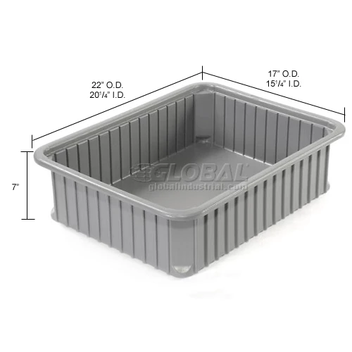 Break-resistant, one piece vacuum-formed construction withstands stacking and versatile, heavy-duty use. Gray molded plastic resists mild acids, machine oils and detergents.