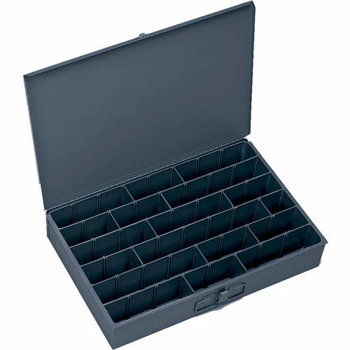 Compartment storage boxes separate items to provide organized storage. Compartment boxes are made with prime cold rolled steel for strength that lasts. Storage boxes include high impact styrene inserts to separate container into compartments. Adjustable Compartment Boxes include 6 fixed horizontal compartments and 12 removable dividers that adjust on 1″ centers for customizable compartment sizes. Each compartment has a scooped bottom for easy parts removal. Lid features full length piano hinges for rigidity. Positive locking pull-down catch keeps lid tightly closed to secure contents in compartment. Storage boxes measure 18″W x 12″D x 3″H overall. Gray powder coat finish.