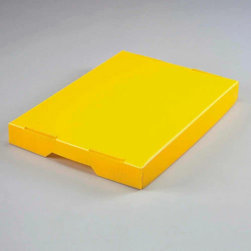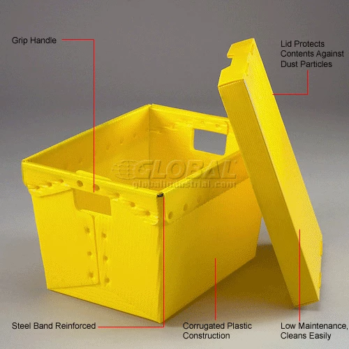 Lightweight, yet tough, this corrugated plastic tote is steel band reinforced at the top for added strength and rigidity. Easy to clean, resistant to dirt, moisture and grease. Convenient hand holes for easy carrying. Snug fitting lid protects contents against dust and dirt. Nests for space saving storage. Meets US Postal Service requirements.