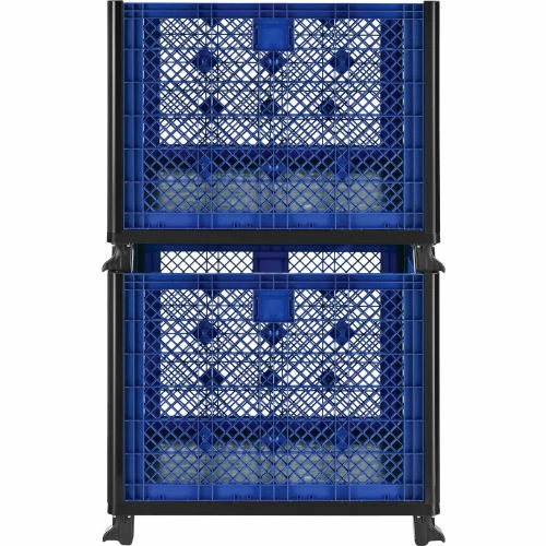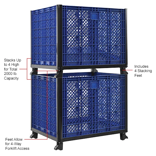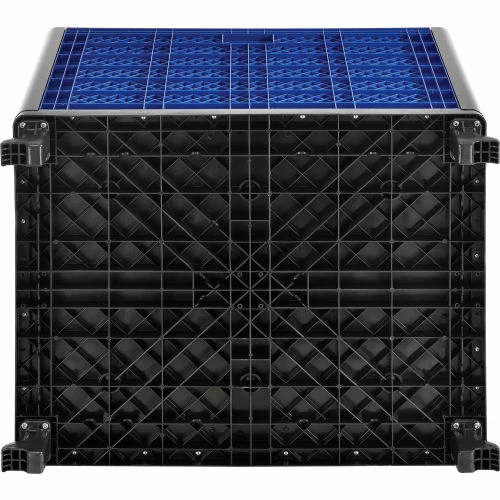 This structurally reinforced bulk storage container is made from high density blue polypropylene for a total capacity of 600 lbs. Stacks up to 4 high for a total of 2000 lbs. and includes 4 feet for stacking. Vented panels allow light, air and sprinkler circulation. Feet also allow 4-way forklift access. Measures 39-1/4″L x 31-1/2″W x 33-1/2″H overall. Bulk containers are shipped flat for reduced shipping. Posts and panels are easy-to-assemble to base using included hardware.