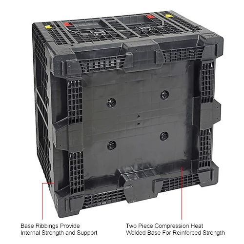 Box style “Carcass Joint” improves impact resistance and allows for firm sidewall positioning and locking. “U-Channel” ribbing pick-up both vertical top loading and horizontal stresses to reduce sidewall torsion and deflection. “Floating Finger” hinge allows for easy assembly and disassembly of the container. The integrated “T-Slot” picks up additional vertical forces present in certain application, absorbs impact, and aligns the walls. The two piece compression heat welded base design creates the most solid base using the fewest raw material. The ribbings run throughout the entire base of the container providing internal strength and support.