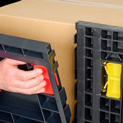 2 hinged drop down doors fold flush against container for easy access to contents. Folds easily with plastic ergonomic latches. High return ratio for reduced costs on these newly designed folding shipping containers; 252 folded containers on a 53′ truck. These plastic shipping containers include labeling area on sides. Allows 4-way forklift access. Overall Dimensions: 48″L x 44-1/2″W x 34″H. Folds to 12-1/2″H. 2000 lb. capacity.