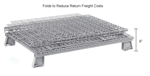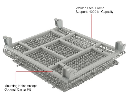 Open mesh construction provides excellent visibility, easy inventory control and eliminates dust and dirt build up. This one piece heavy-duty container features wire mesh arc-welded to a channel formed steel base. Sides and corners are heavily reinforced. Notched, positive stacking legs permit handling by forklift or pallet truck. Drop gate allows access when stacked. Durable powder coat finish resists rust and corrosion. Sets up in seconds.