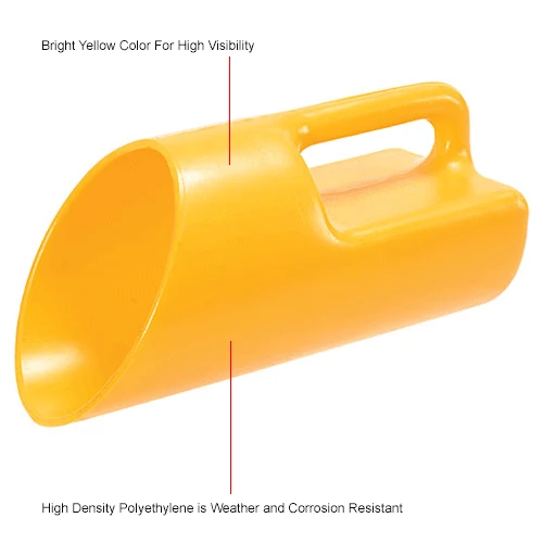 Made using high density, UV protected polyethylene that is water, weather and corrosion resistant. Hand Scoop allows easy dispensing and spreading of salt or sand contents. Molded in handle for easy lifting. Bright yellow color with 4 liter capacity.