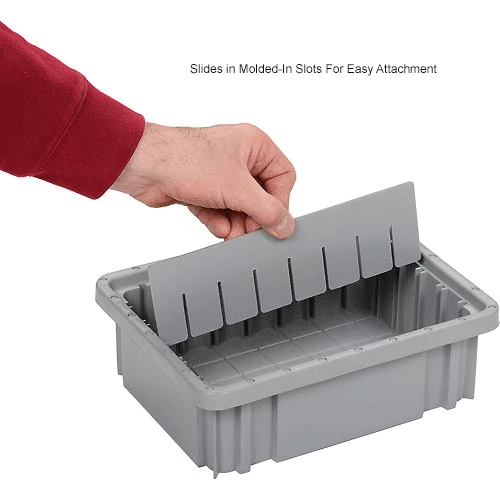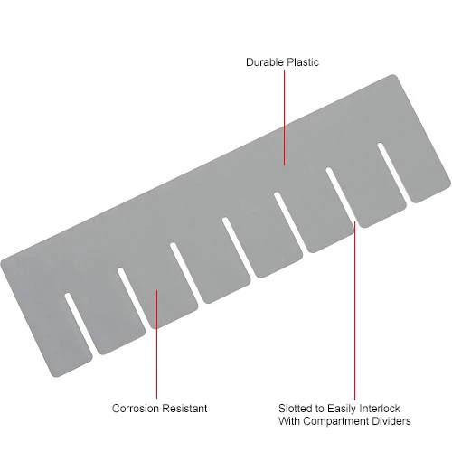 Durable, corrosion resistant plastic dividers help compartmentalize your grid boxes for efficient, organized storage. Dividers are slotted to accept cross interlocking with Width Dividers (sold separately). Dividers are gray and sold in packages of 6.