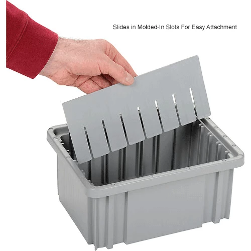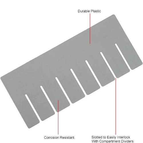 Durable, corrosion resistant plastic dividers help compartmentalize your grid boxes for efficient, organized storage. Dividers are slotted to accept cross interlocking with Width Dividers (sold separately). Dividers are gray and sold in packages of 6.