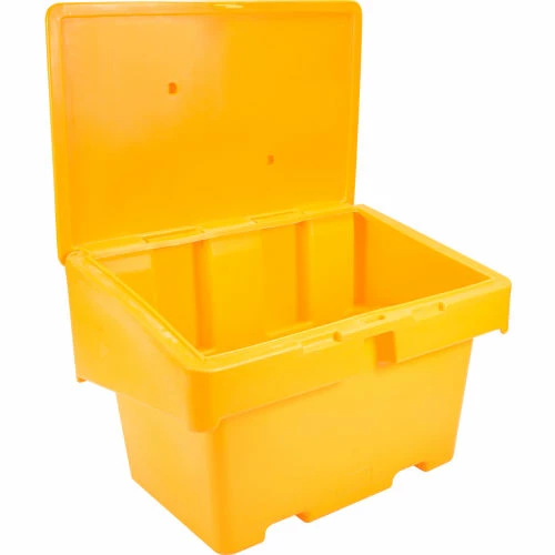 Ideal for storing salt, sand, garbage, pool chemicals, spill kits and anything requiring protection from the elements. Watertight Global Industrial Outdoor Storage Bins are built to withstand a wide range of conditions from sub-zero temperatures to extreme heat. Molded with moisture-resistant rotationally-molded polyethylene, these durable bins will not rust, dent, or corrode. Double wall hinged locking lid (padlock not included) closes securely keeping out rain, snow and sun. Unique stackable and nestable design saves on storage space and shipping. 2-way fork access. 5 year limited warranty.