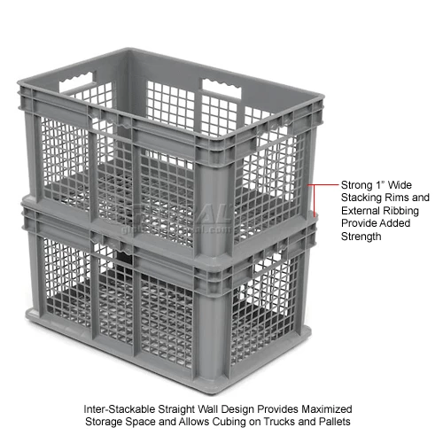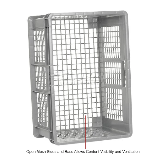 Mesh-sided containers have an open .72 x .9 mesh pattern which allows high visibility and good airflow.