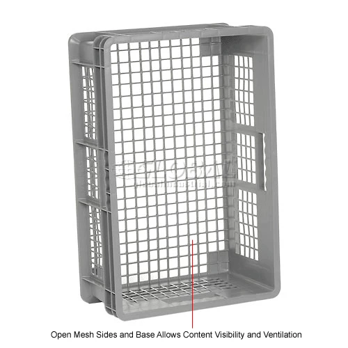 Mesh-sided containers have an open .72 x .9 mesh pattern which allows high visibility and good airflow.