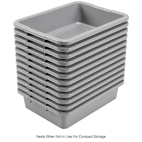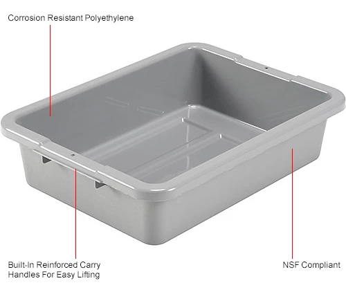All-purpose plastic storage bus tubs are built to last. Manufactured from polypropylene, these containers are engineered for rigorous and continuous usage. All tubs are super easy to clean and dishwasher safe. Virgin grade materials afford lifetime projection against bacteria, old, mildew and product degradation. All-purpose tubs provide a storage, cleaning, and transportation solution for multiple applications. Built in handles are ergonomically designed for comfortable and easy-grid and handling. All tubs nest when empty saving valuable workspace. NSF certified. Made in USA.