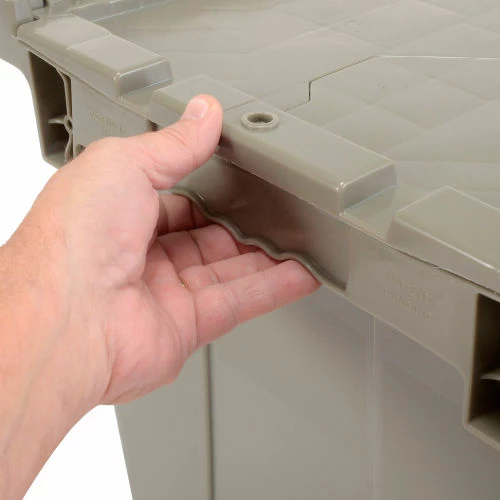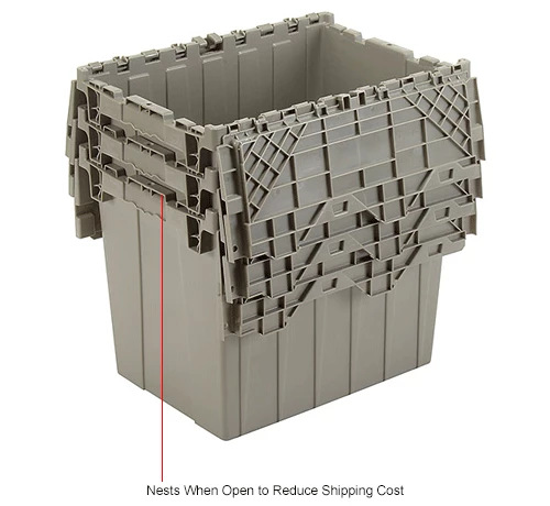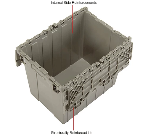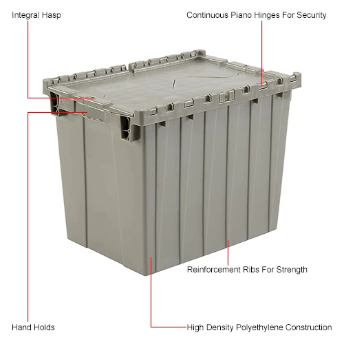 Safe, Secure, and Sustainable. The improved all plastic attached lid container leads the industry in design and proven performance. Taken out was the traditional metal hinge –replacing it with a safer and more durable all plastic hinge. This series of plastic shipping containers is the choice of much of the distribution industry. Manufactured from high grade-high density polyethylene plastic, the enhanced storage container is made to ship, store, and distribute goods and products in the toughest of environments. The all new plastic hinge design means there is no metal in the hinge of the container –making this container the safest and most sustainable in the market. Raised lip edges allow secure stacking. The attached lid container saves money too while allowing empty containers to nest inside each other when not in use. Molded grip handles have an integral hasp to accept cable ties for security. The Best Value plastic storage container offers increased safety and durability –all at a great value.
