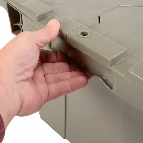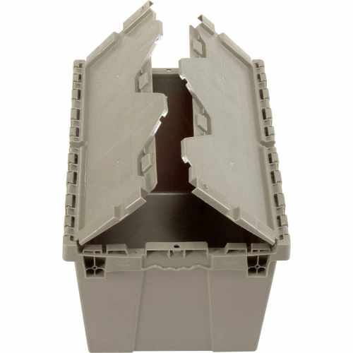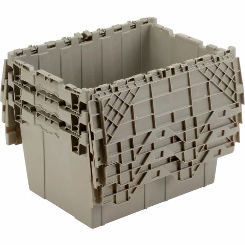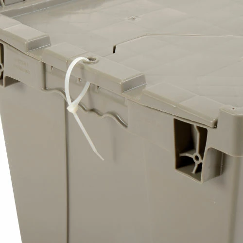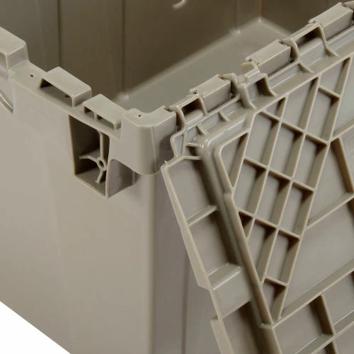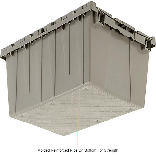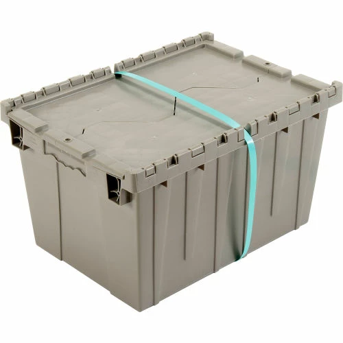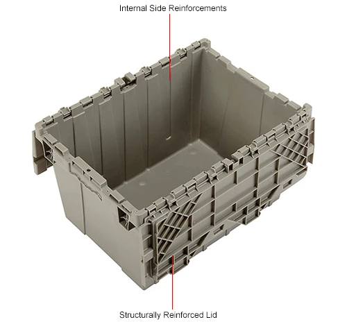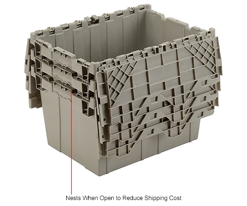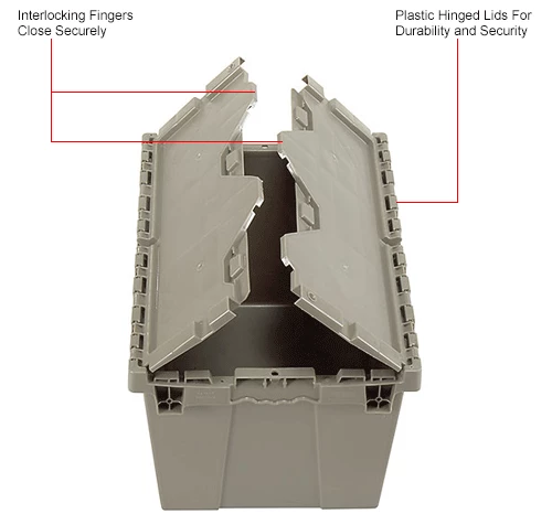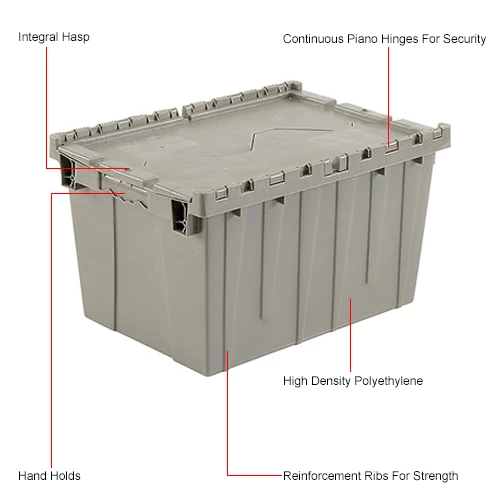 Need it safe, secure, and sustainable? The Global Industrialโข Plastic Shipping Storage Tote With an Attached Lid is an ideal choice for the distribution industry. Manufactured from high grade-high density polyethylene plastic, the enhanced storage container is made to ship, store, and distribute goods and products in the toughest of environments. The all-new plastic hinge design means there is no metal in the hinge of the container โmaking this container the safest and most sustainable in the market. Raised-lip edges allow secure stacking. The attached lid container saves money too while allowing empty containers to nest inside each other when not in use. Molded grip-handles have an integral hasp to accept cable ties for security. The Best Value plastic storage container offers increased safety and durability โ all at a great value.