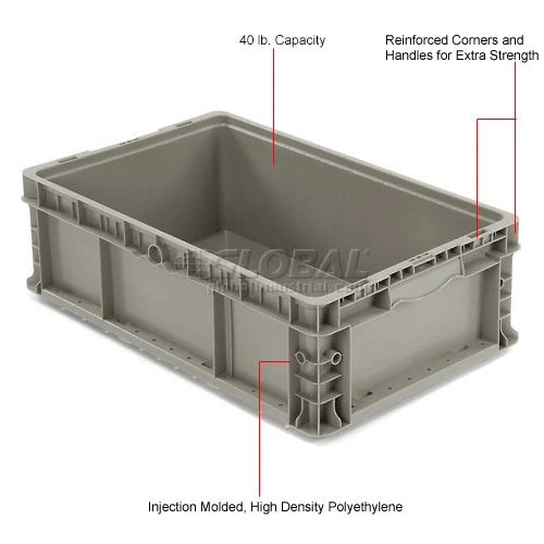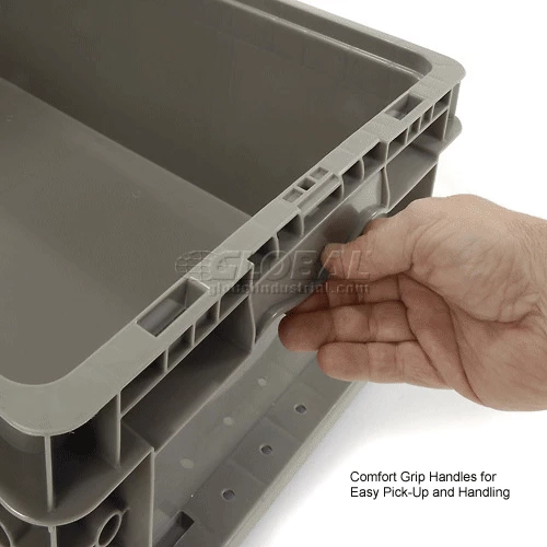 Efficiently transport goods or work in progress. These injection molded, high density gray polyethylene containers have reinforced corners to handle even the heaviest items, offering a stacking capacity of 50 lbs. Straight-walled sides allow various sizes to stack securely and fit accurately on standard sized pallets. Comfort grip handles on 2 sides.
