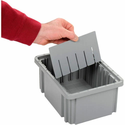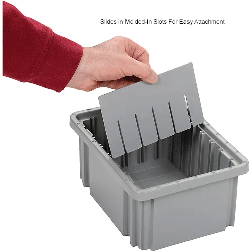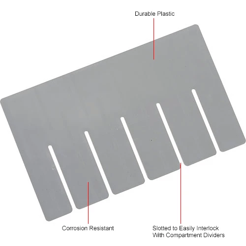 Durable, corrosion resistant plastic dividers help compartmentalize your grid boxes for efficient, organized storage. Dividers are slotted to accept cross interlocking with Length Dividers (sold separately). Dividers are gray and sold in packages of 6.