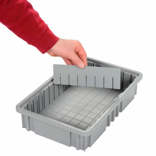 Durable, corrosion resistant plastic dividers help compartmentalize your grid boxes for efficient, organized storage. Dividers are slotted to accept cross interlocking with Length Dividers (sold separately). Dividers are gray and sold in packages of 6.