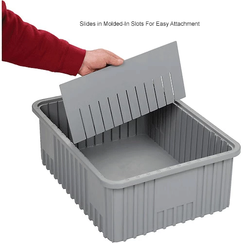 Durable, corrosion resistant plastic dividers help compartmentalize your grid boxes for efficient, organized storage. Dividers are slotted to accept cross interlocking with Length Dividers (sold separately). Dividers are gray and sold in packages of 6.