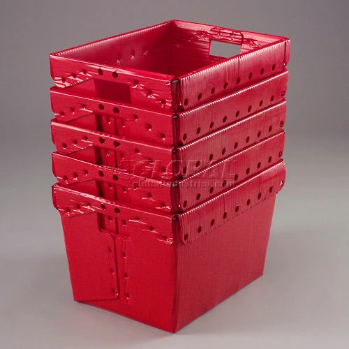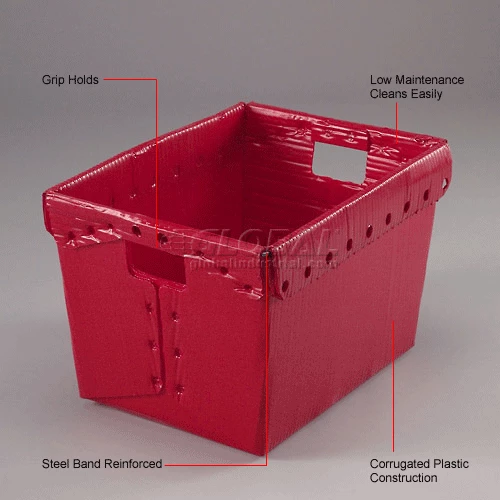 Lightweight, yet tough, this corrugated plastic tote is steel band reinforced at the top for added strength and rigidity. Easy to clean, resistant to dirt, moisture and grease. Convenient hand holes for easy carrying. Nests for space saving storage. Meets US Postal Service requirements.