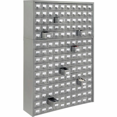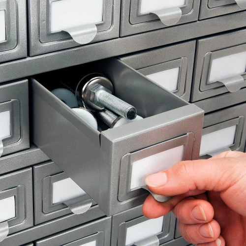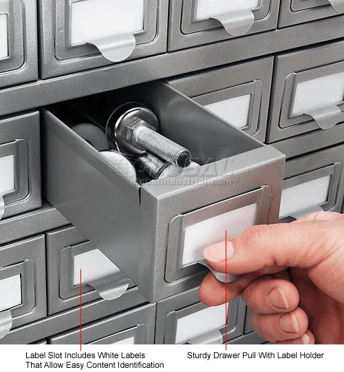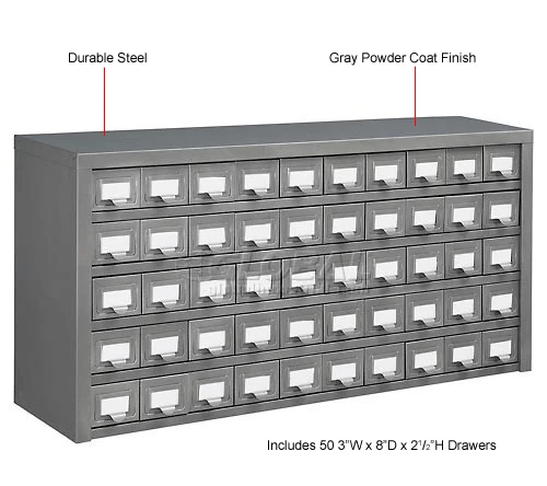 Welded steel construction. Smooth gliding 3″W x 8″D x 2-1/2″H drawers with drawer stops…prevents accidental pull-out. Sturdy drawer pull with label holder and labels. Fully assembled…ready for instant use. Gray enamel finish.