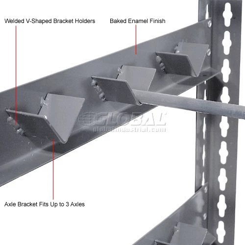Sturdy steel construction. Includes one pair of adjustable 24″D beams with 3 welded “V” shaped axle brackets that are adjustable on 1-1/2″ centers and one 48″L x 3/4″ diameter axle.