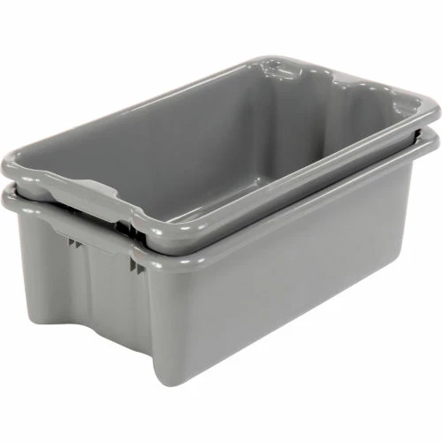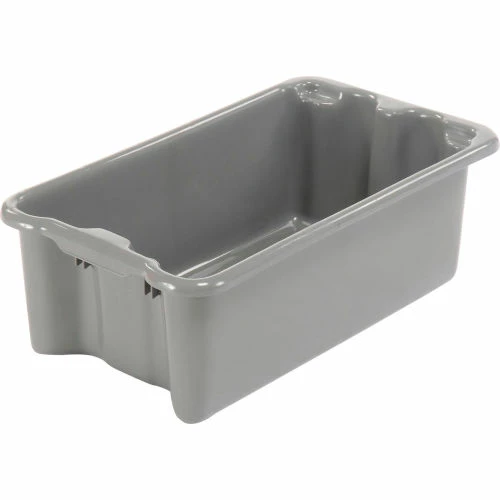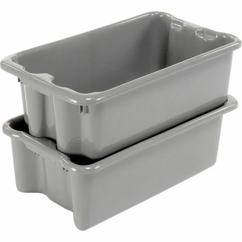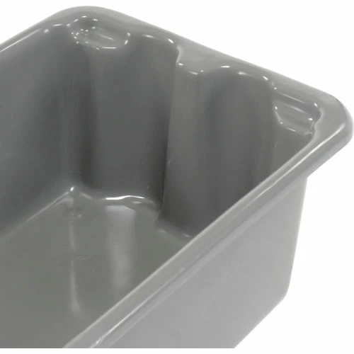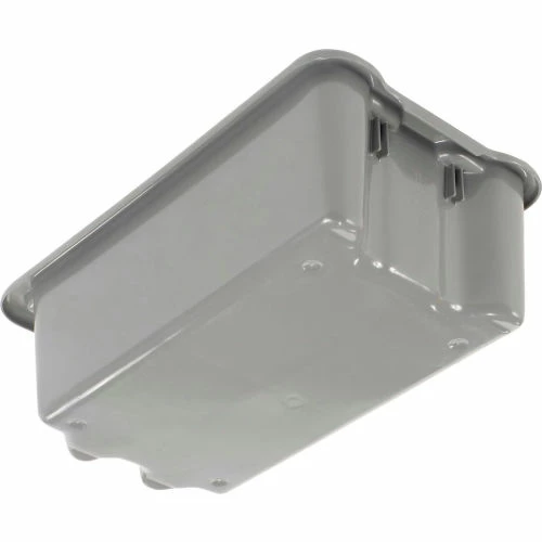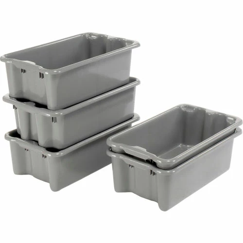Designed to endure years of rugged use, these plastic containers are ideal for manufacturing, food processing, distribution and storage. High density polyethylene resists oils, solvents, most chemicals and steam and withstands 0° to 120°F. These Gray plastic containers are FDA approved for direct food contact. Reinforced construction provides 70 lb. capacity per container. Stacks when full – Bottom container supports 300 lbs. when stacked. Nests when empty at an alternating 180 degree position. Sold in packages of 5.