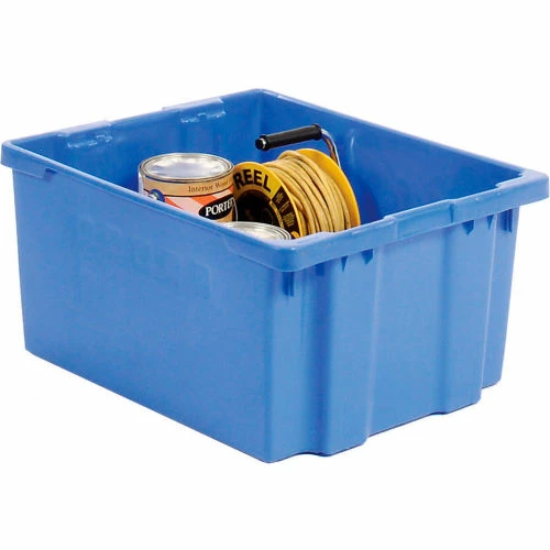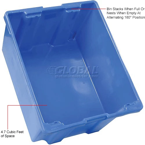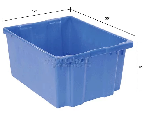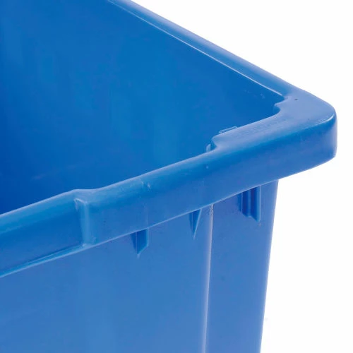 Designed to endure years of rugged use, these plastic containers are ideal for manufacturing, food processing, distribution and storage. High density polyethylene resists oils, solvents, most chemicals and steam and withstands 0° to 120°F. These Blue plastic containers are FDA approved for direct food contact. Reinforced construction provides 70 lb. capacity per container. Stacks when full – Bottom container supports 300 lbs. when stacked. Nests when empty at an alternating 180 degree position. Sold by the piece.