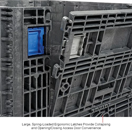 Shipping containers are ideal for transporting large quantities of parts for work-in-process, storage and transportation applications. These bulk containers fold when empty to reduce costs on return freight and storage. Structurally reinforced foam molded high density polyethylene resists rust, odors and moisture. Folding containers allow positive stacking to reduce floor space. Reusable plastic containers are structurally reinforced at all stress points for added strength and stability. Smooth interior surface cleans easily. Large, spring-loaded ergonomic latches make collapsing containers and opening/closing access doors easy. Folding storage containers allow convenient four-way forklift access. Optional Lid protects contents (sold separately).
