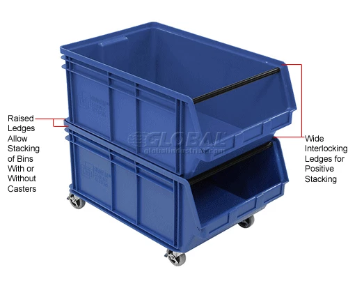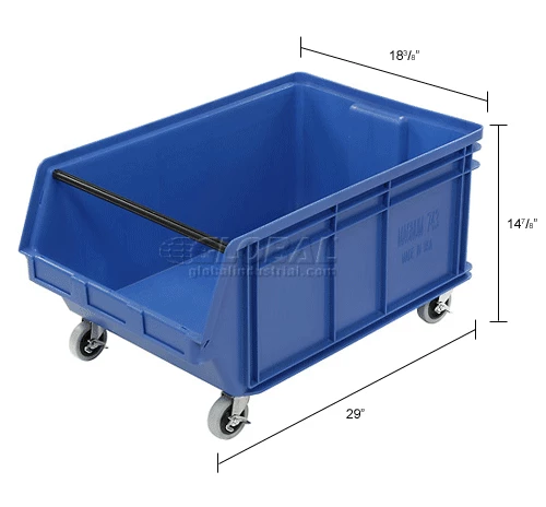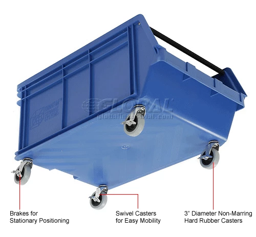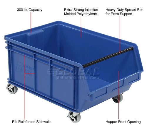 These bins are constructed of extra-strong injection molded polyethylene. The hopper front allows immediate access and visibility, while ribbed reinforced walls ensure superior strength. FDA Compliant Resin & Colorant. They feature wide interlocking ledges for positive stacking. Impervious to most solvents, corrosion, rust and rot resistant. Resists temperatures from -40ยฐF to 180ยฐF. Includes heavy duty spread bar for extra strength and support. Label holders are molded in. Mobile Bin with Casters have a 250 lb. capacity and moves easily on 3″ non-marring hard rubber swivel casters with brakes. Sold in carton quantities.