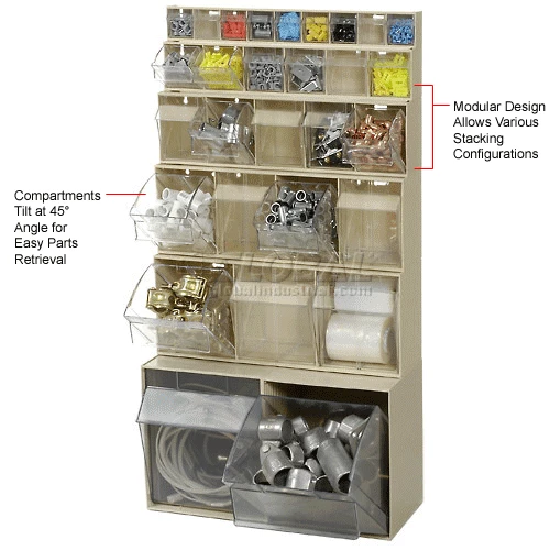 Modular design allows you to stack different sizes. Durable, polystyrene case and transparent bins. Compartments tilt at a 45ยฐ angle and can be