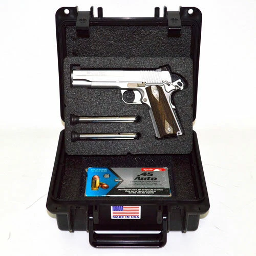 Quick Fire QF300 1 pistol case designed specifically to hold or carry your valuable 1911 pistol. This case is airtight, watertight and includes 1 removable foam insert to hold your pistol and 2 additional magazines. Underneath is an accessory compartment for holding additional magazines or other items. The foam is a 1.8# micro-cell polyethylene foam, resistant to oils and water, tough and durable. The case is black, includes o-ring seal, automatic purge valve, has molded in holes to accept most padlocks, includes 2 Keyed locking latches. Made in America and comes with a Lifetime Warranty.