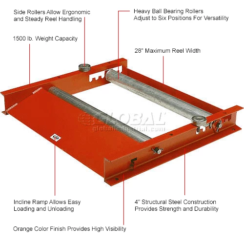 Simple one man operation saves time and effort. The most efficient method for winding or dispensing wire, cable, rope, hose and chain. Accommodates all reel diameters. Rear roller adjusts to six positions. Incline ramp permits easy loading and unloading. Constructed of 4″ structural steel with heavy ball bearing rollers. Side rollers permit easier, steadier reel handling. 1500 lb. capacity, maximum reel width 28″. 31-1/2″W x 28″D overall.