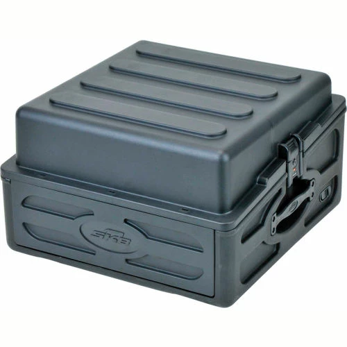 The 1SKB-R102 is a 10U slanted top and 2U front, rack case that features steel threaded rails, hard lid and doors, side access ports (for cable routing) and has enough space to mount the AV-8 with the lid closed The one piece base is roto-molded of Linear Medium Density Polyethylene (LMDPE) while the hard front and rear doors and lid are Injection molded of Rubber Modified Styrene (RMS). The back lid provides maximum access to the rack gear. Two TSA locking SKB patented trigger latches secure the lid while the flat hard top allows for stacking in transport and storage.