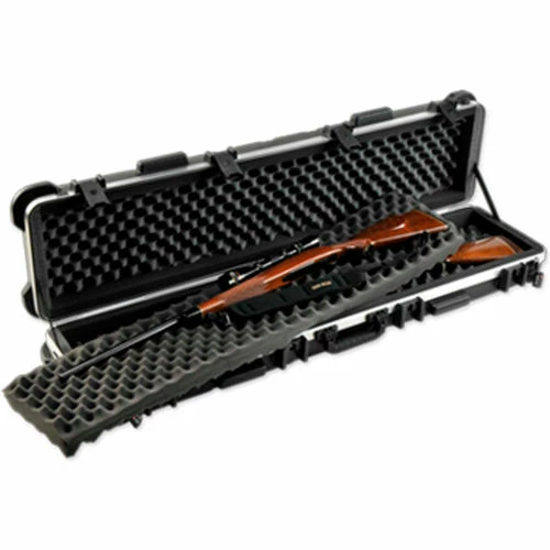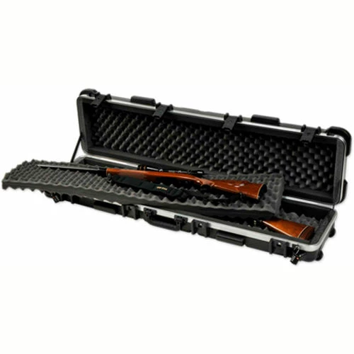 SKB’s 2SKB-5009 ATA Double Rifle Transport is made to ATA 300 Category 1 specifications, ensuring the products ability to withstand 100 trips by air, the highest shipping container specification of the ATA. Capable of accommodating two rifles with SKB’s trademarked “bunk bed” storage system with foam dividers that provide a separate compartment to protect two rifles. The 2SKB-5009 features SKB’s unique Perfect Match Valance Bending System for a perfect seal. This case is constructed of a HDPE shell with weather resistant O-ring seal, stackable, bumper protected hardware with new patented fiberglass and nylon reinforced patent-pending industrial strength latches (two non-lockable and two lockable*) that have been engineered for a lifetime of easy smooth service. Durable built-in poly wheels and both carry and tow handles for easy transport all come standard. The 2SKB-5009 Double Rifle Transport Case is backed by an Unconditional Lifetime Warranty. Capable of accommodating two rifles with SKB’s trademarked “bunk bed” storage system.